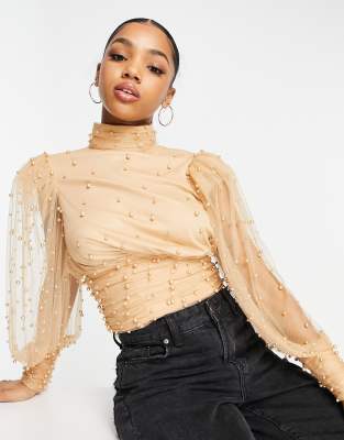 ASOS Luxe Organza Puff Sleeve Embellished Top in blush-Pink